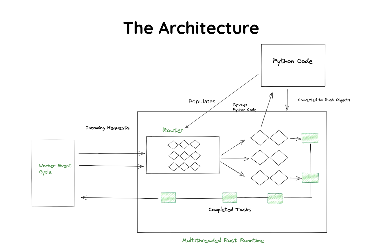 Robyn 基于多进程、多线程模型构建,结合了 Python 和 Rust 的优势。它使用一个主进程来管理多个工作进程,每个工作进程可以处理多个线程。这种设计使 Robyn 能够高效利用系统资源并处理大量并发请求。